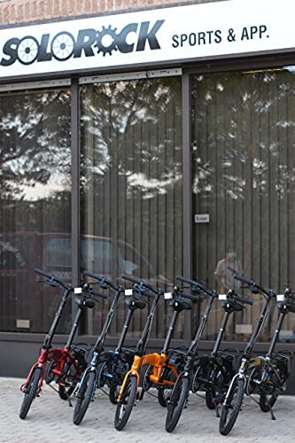Installed Microshift 8 Speed Trigger Shifter / Derailleur to replace 7 Speed Shimano Tourney for better riding performance; Model: Dash SRFPA1682 Frame Size: 16″ Aluminum Frame Speed: 8 Speed Microshift; Brand: SoloRock Features: Frame, Fork, Handlebar, and seat post: 6061 Aluminum; Folding Hinges for top tube and handle bar: Patented forged aluminum folding hinges; Patented semi-arc clamps; 3D Forged; Folding Size: 29x74x57cm or 11.4”x29.1”x22.4”; Bike Weight: 11.5kg or 25.3lb approx.; Rider Weight: 100kg or 220lb Max.; Rider Height: 1.45m-1.90m or 4’9”-6’3”; Rider Age: Adult; Folding Time: 15 sec.; Frame/Fork: Aluminum; Cockpit: Handlepost: 6061 aluminum alloy handlepost, forged aluminum alloy folder; Handlebar: 6061 aluminum alloy, angle adjustable; Headset: Integrated; Saddle: High density form fill with clamp; Seatpost: 6061 Aluminum, thickened and length extended; Special seat tube bushing; Brakes: Promax V-Brakes, Linear Spring; Aluminum Levers / Aluminum Brackets; Wheels: Rims: Anodized 6061 Aluminum, CNC-ed and double-walled; Spokes: 14G Stainless Steel; Tires: 16” x 1.5” Kenda BK; Transmission: Shifter / Derailleur: Microshift 8 Speed; Crank Set: Forged Aluminum; 52T Steel chain wheel 170 mm Arm, Aluminum Chain Wheel Guard; Bottom Bracket: Cartridge, ED BK; Chain: Anti-Rust Surface Finished; Pedals: Folding With Reflector, BK; Accessories: Kick Stand: Aluminum Centre stand, BK; Fenders: Plastic with tail flap; Rear Carrier: Aluminum Alloy, ED BK; Bell: Silver; Decals: Undercoating; Folding Bike Carry Bag: Optional; Note: Parts may slightly vary from the above specs; Packaging: Gross Weight: 15.5kg; Carton Dimensions: 77 x 36 x 58 cm (30.3” x 14.2” x 22.8”); Color: Pearl Orange, Metallic Blue, Matt BK, Matt Red (Carmine), Glossy Gray. Warranty: 12 month Frame, Parts Wearing Excluded. SoloRock, Rocks For A Greener Planet!