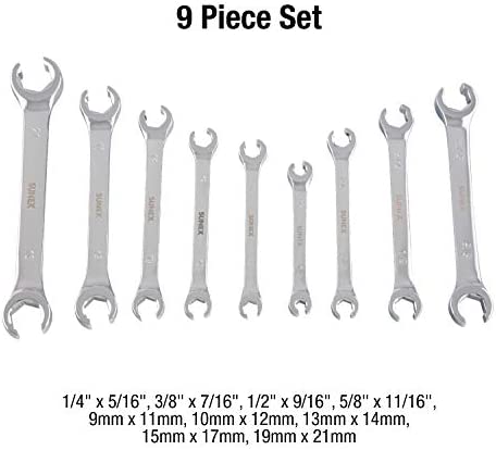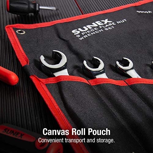Sunex 9809A Flare Nut Wrench Set, 1/4″x5/16″ – 5/8″ – 11/16″, 9mm x 11mm – 19mm x 21mm, Fully Polished, 9-Piece (Includes Roll-Case)