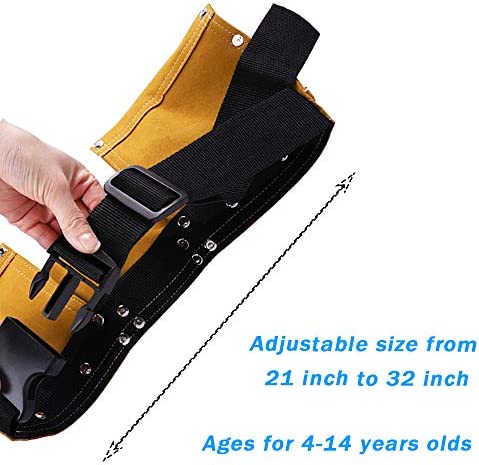 SIZE: Made for kids with heavy-duty nylon strap.Leather kids tool belt with 3/4 inch adjustable nylon belt.Waist size: 21 inches to 32 inches. (usually ages 4-14).