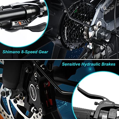 Full Suspension System: The adult folding ebike is equipped with perfect all-terrain suspension systems–the hydraulic fork and quad-link rear; You can ride the electric bikes for adults anywhere you want on the hills if the roads are bumpy slope when you are riding, with our better fork and shock absorption, giving you the best off-road experience! And it is safer and more comfortable.
