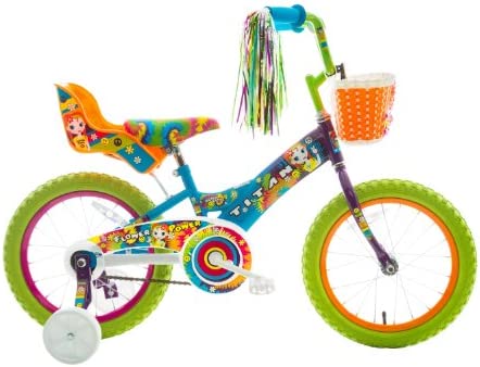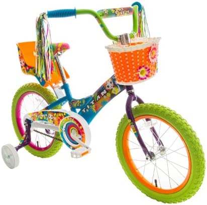 Girls 16-inch Flower Power BMX The only girls bike that includes a doll seat, a basket, streamers, and training wheels