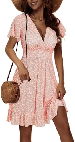 Fashion Style: Short Sleeve/ Deep V Neck/ Above Knee/Floral Print/ Swing Dress/ Flowy Dress/ A Line Dress/ Ruffled