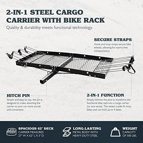 The unique design allows this 2-in-1 carrier to function as a cargo carrier or as a bike rack by simply removing the pins to turn the bike rack into a cargo carrier or vice versa; fits 2″ receivers for easy mounting onto your vehicle