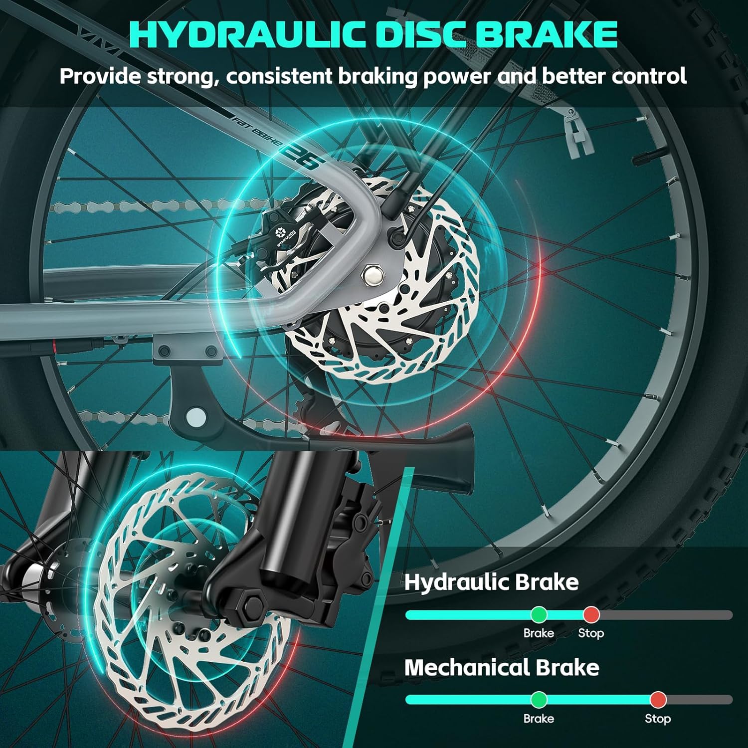 ALL TERRAIN FAT TIRE MOUNTAIN BIKE: Electric mountain bike features 26* 4.0″ fat tires that are wear-resistant, excellent grip and slip resistance, perfect for any road condition, including sand, snow, gravel and mountain paths