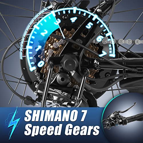 【GEAR& LIGTH& BRAKES】- Shimano 7-speed transmission gear increases the climbing ability and can smoothly change the speed as needed during riding. The bell, bright LED headlights ensure safe riding at night. Our e-bike features dual disc brakes with a motor inhibitor and motor cut-off switch that can achieve high performance in all weather conditions.