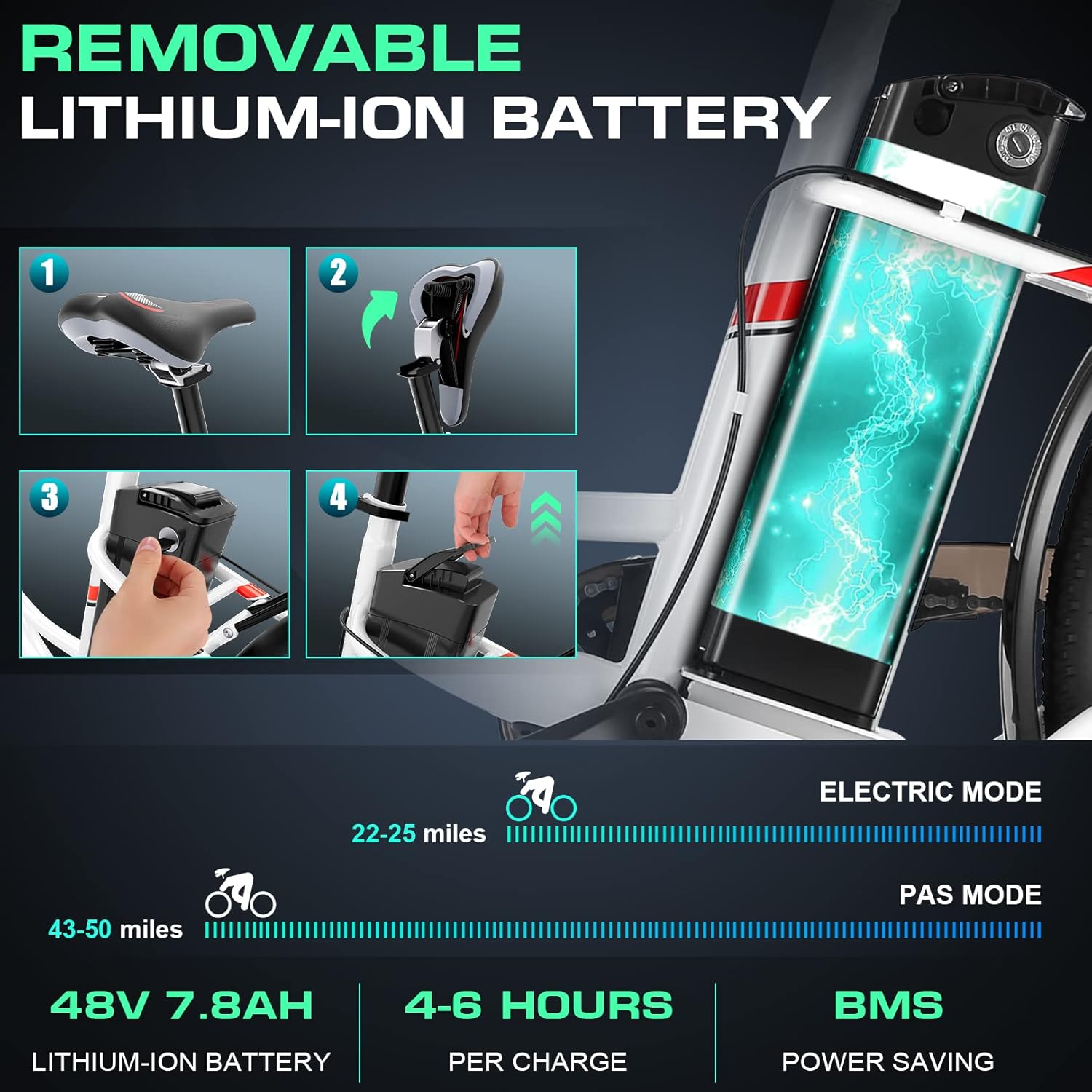 【REMOVABLE BATTERY】Equipped with the removable battery, this ebike is capable to achieve 22-25 miles in full electric mode and 44-50 miles in pedal assist mode (PAS mode). Two charging ways, charging on the bike or removing the battery for charging, you can bring the battery to your home or office to recharge, fully charged in 4-6 hours. Your daily commute will be faster and more cost-efficient.