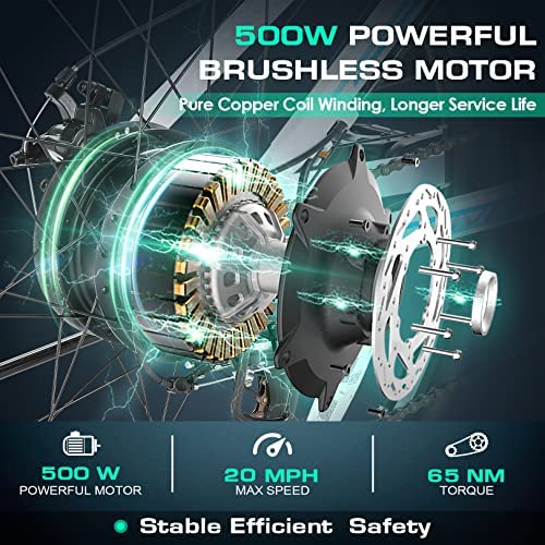 【STRONGER 500W MOTOR】26” electric mountain bike is equipped with a 500W high-speed brushless motor, which provides enough power, max speed is up to 20 mph. Enough for your daily riding on all terrains, ensuring excellent riding experience.