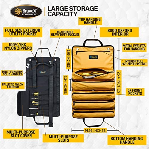 Heavy Duty Tool Roll – Outside covering is made of 1200D ballistic nylon, and 800D Oxford inside cloth with waterproof PU layer; Kevin thread and YKK zipper provide high tear resistance.
