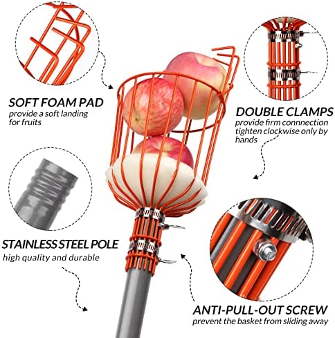 Easy to Assemble and Use: This fruit picker just only takes a few easy steps to install. For pole assembly, just rotate and tighten the required number of poles. Double upgraded metal clamps allow you to tight the basket to the pole only by hands. No screwdriver required, fruits picking basket attaches easily and securely onto extension pole. The fruits catcher is also detachable and can be easily stored. Easy to use. Hook the basket to the branch and gently pull fruit into the harvest basket.