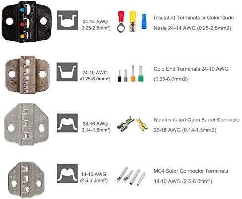 Non-insulated open barrel connector 26-16 AWG (0.14-1.5mm²); MC4 solar connector terminals 14-10 AWG (2.5-6.0mm²).