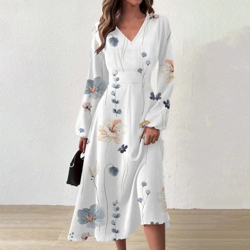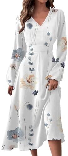 Women Fall Dresses 2024 Long Sleeve V Neck Solid Color Maxi Dress Boho Long Dress High Waisted A-Line Flowy Dress
