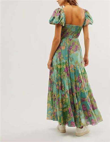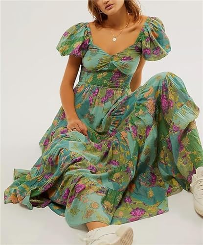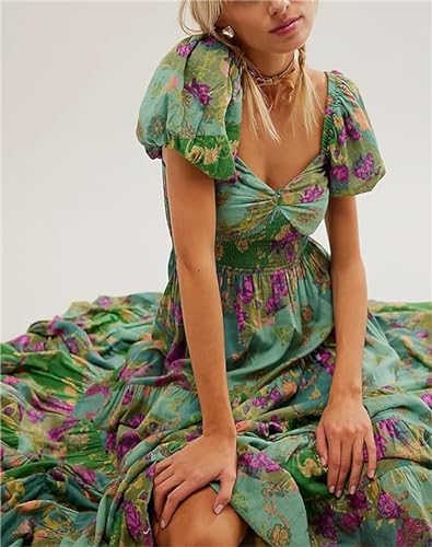 Women’s Flower Print Long Dress Short Puff Sleeve Sweetheart Neck Tunic Waist A-Line Dress