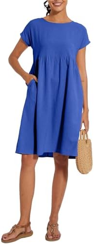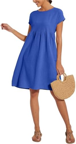Womens Summer Casual Short Sleeve Crewneck Swing Dress with Pockets