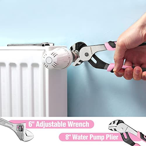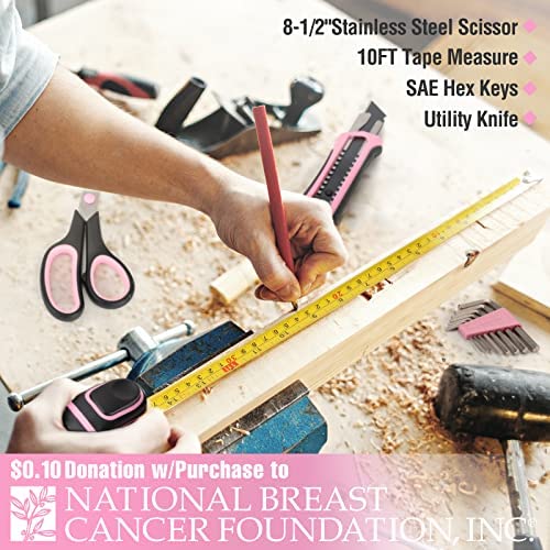 52-Piece Pink Tool Set – This hand tool kit has all the most useful and necessary tools for home maintenance and daily use. Tool set includes claw hammer, tape measure, pliers, magnetic screwdrivers and bits, adjustable wrench, utility knife, scissor, hex keys, and much more