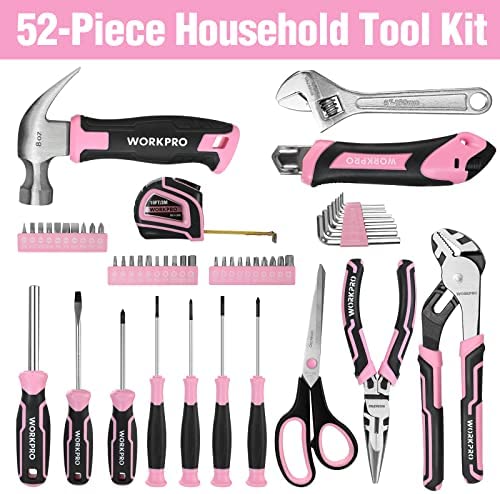WORKPRO 52-Piece Pink Tools Set, Household Tool Kit with Storage Toolbox, Basic Tool Set for Home, Garage, Apartment, Dorm, New House, Back to School, and as a Gift – Pink Ribbon