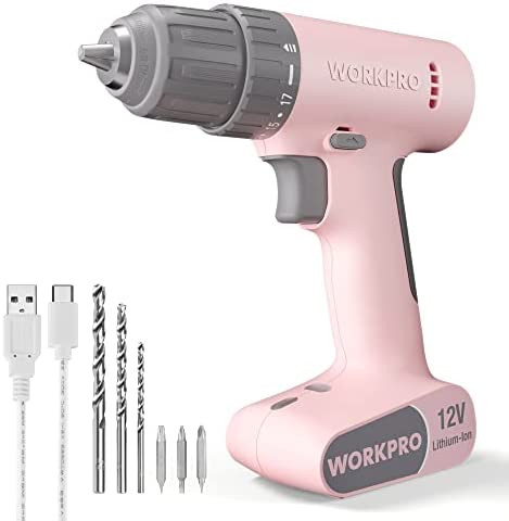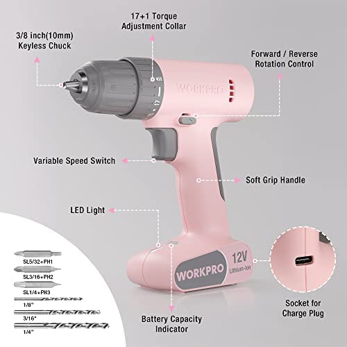 WORKPRO Pink Cordless Drill Driver Set, 12V Electric Power Drill Tool Kit with 6 Pcs Bits, 3/8-Inch Keyless Chuck, Variable Speed, 18 Touque Setting, Type-C Charge Cable, Led Light, Pink Ribbon