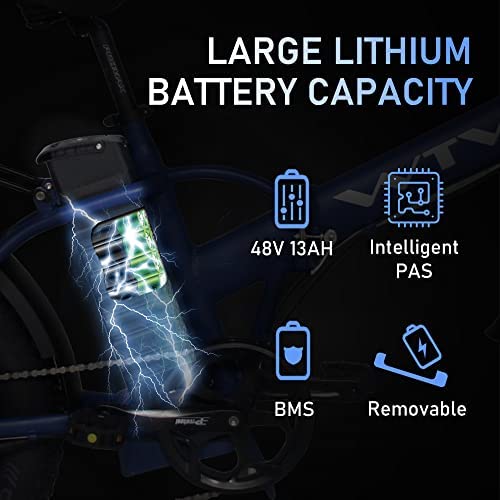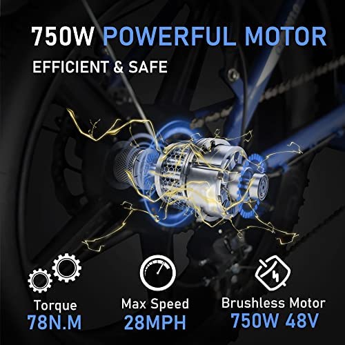 STRONG POWER: 750W Powerful electric bike for adults with 48V 13AH removable lithium battery, top speed of 25-28mph, maximum torque of 78nm, riding range varies from 25miles(in pure power mode) to 48miles (in pedal assistant).