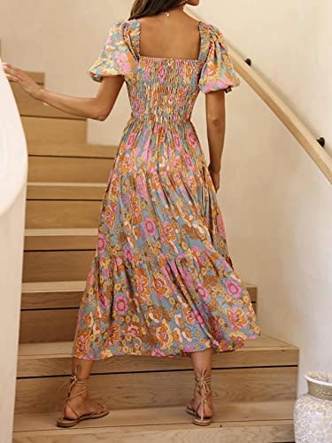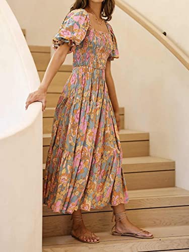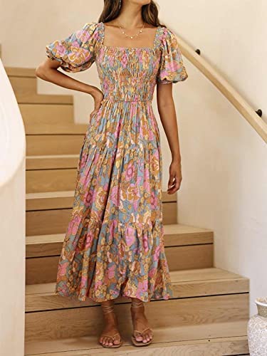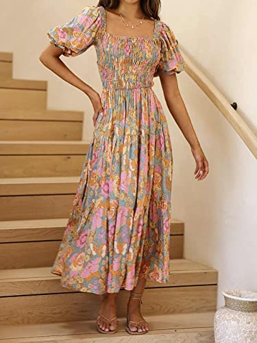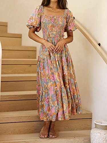Women maxi dress,Fashionable elastic square neck design with special floral print, A line dress with cute elastic puff short sleeve, Beautiful Long dress with ruched bust and flowy hem. Which make you more feminine and charming.