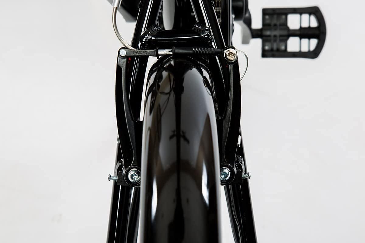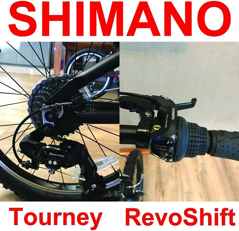 Here are some specifications: All Light Weight Aluminum Alloy – Frame, V-style brakes Genuine Shimano Tourney 7-speeds Derailleur, Shimano Revo 7-Speed Grip Style Shifter Easy single folding aluminum alloy stem Folding pedals for easier storage 20″ Aluminum rims, with black anodized 28H spokes Strong Magnetic Frame Catch keeps the bike secure when folded Weight: 28 lbs (Lightweight Folding bike): Max weight capacity 240 lbs
