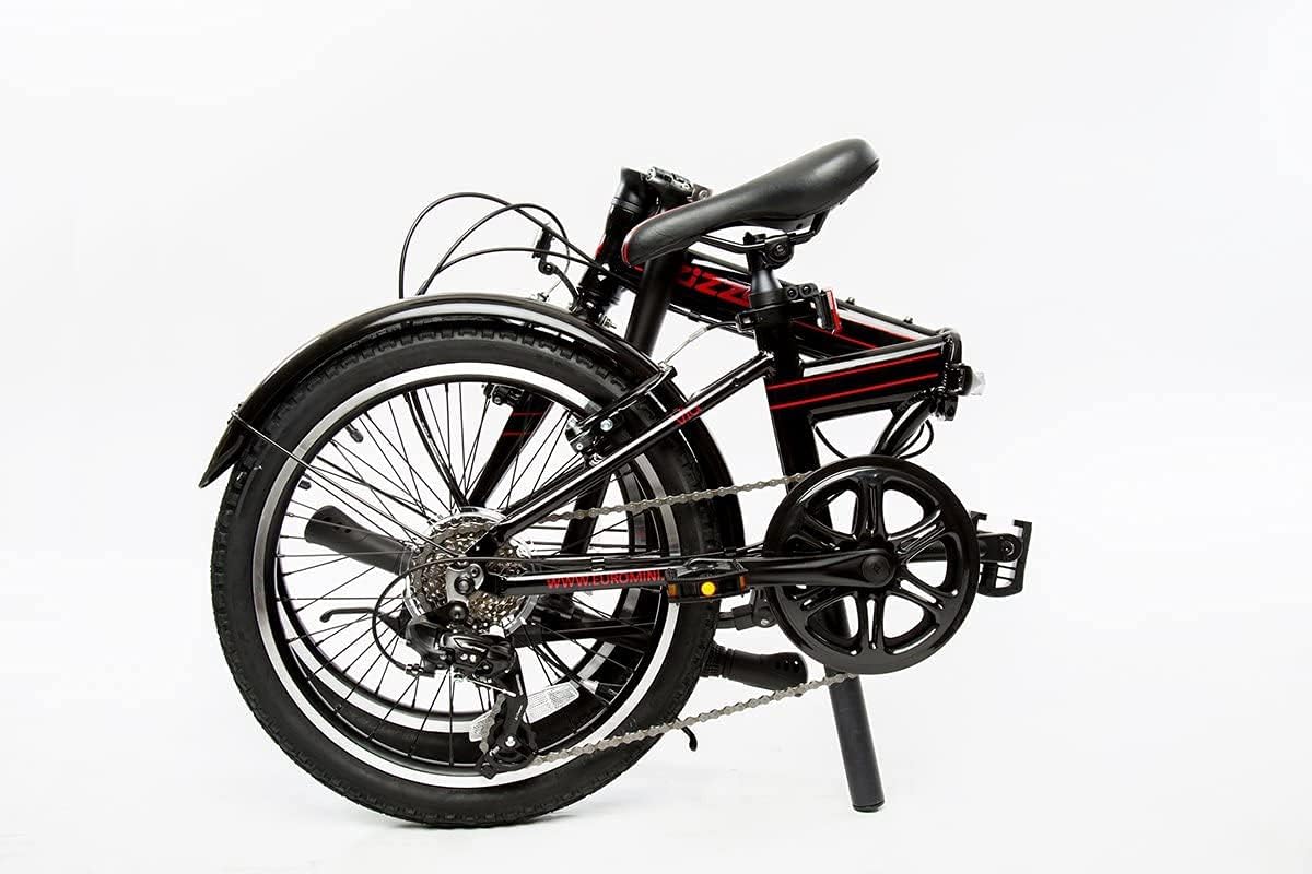 The ZIZZO VIA folds down into the following dimensions: (H-27″ L-31″ W-12.5). Folding is easy and with experience, you can fold the bike within 30 seconds or less. When folded the seat post is lowered and used as a tripod with the two wheels to keep it stable in the upright position.