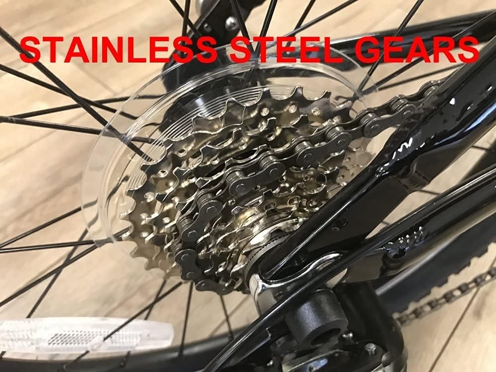 Rust-resistant coated 7-speed cassette and chain to make travel on roads and hills a breeze. The derailleur is attached to the frame with an Aluminum hanger which helps absorb impacts and lessens the chance of damage to the derailleur.